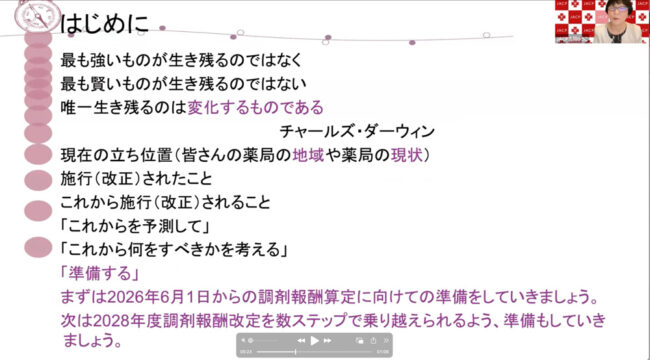 2026年度調剤報酬改定の告示を受けて、算定要件や施設基準などについて解説をしていきます。今回の改定は「患者のための薬局ビション」を実行するための改定です。皆さんの薬局は「行きつけ薬局」を目指されていると思いますので、何も怖いものはありません。調剤基本料とその加算で最高点数を算定できるように施設基準の届出をし6月1日に向けての準備をしてください。それから今回かかりつけ薬剤師指導料が廃止になり、かかりつけ薬剤師の服薬指導が服薬管理指導料に組み込まれました。そしてかかりつけ薬剤師だと算定できる加算が新設されています。その対応策のお話もします。最後に今後の電子処方箋に向けての準備などのお話もします。